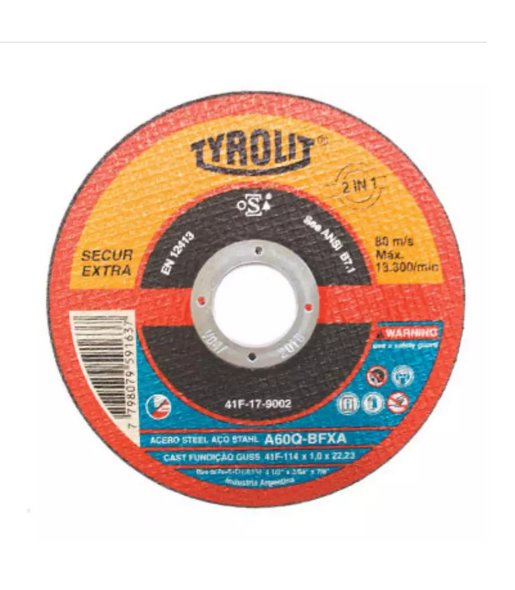 - Disco 2 em 1 para aço (carbono) e aço inoxidável, oferece uma solução economicamente viável para o seu dia-a-dia aliada ao habitual padrão de segurança da TYROLIT. Essas características se devem à ótima vida útil e estabilidade do disco de corte SECUR EXTRA**