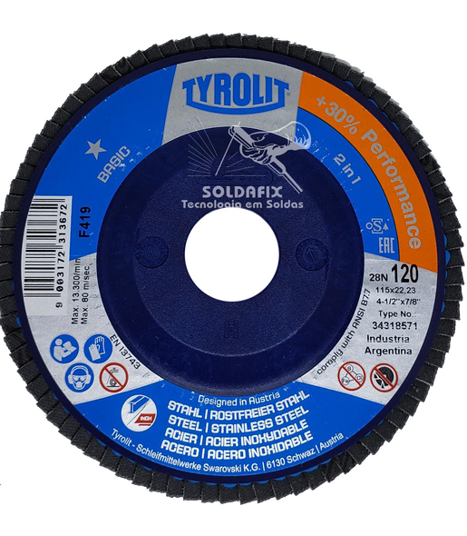 - DISCO FLAP PARA AÇO INOX/ CARBONO G 120 TYROLIT BASIC* 4 1/2 X 7/8.