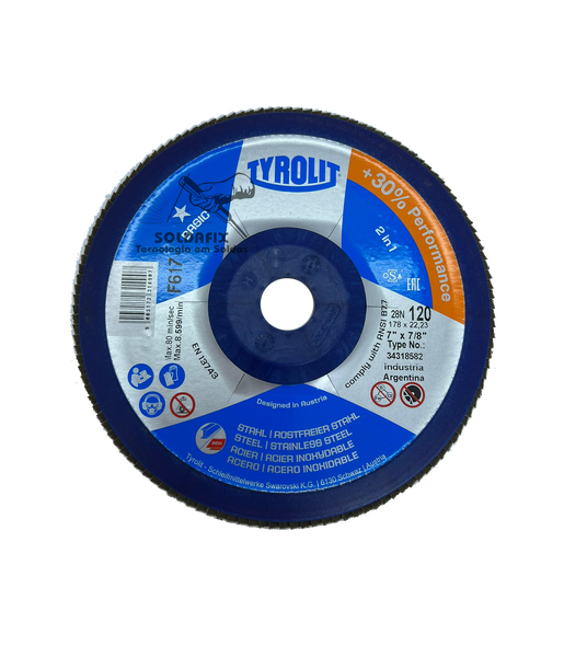 - DISCO FLAP PARA AÇO INOX/ CARBONO G 120 TYROLIT BASIC* 7" X 7/8.