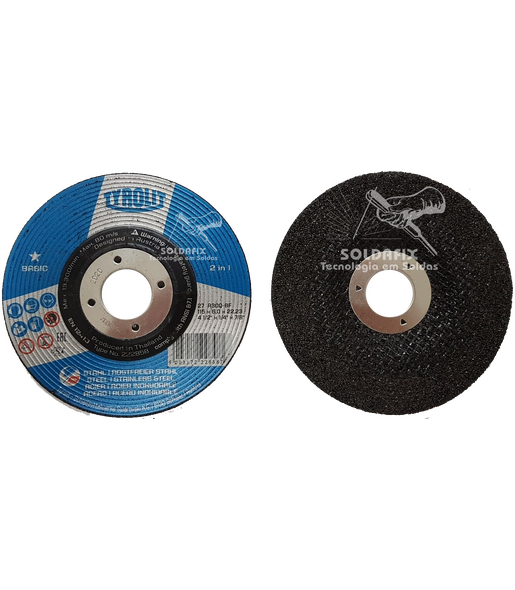 - Disco 2 em 1 para aço (carbono) e aço inoxidável. Menor pressão para tarefas de desbaste universal com uma boa vida útil.