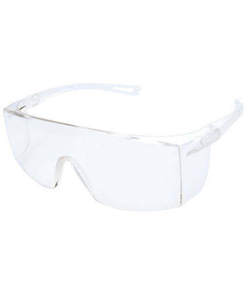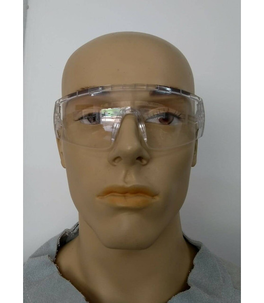 Descrição: Óculos de segurança constituído de arco de material plástico preto com visor de policarbonato incolor, proteção lateral na mesma peça com o arco fixado às hastes por meio de pinos metálicos.